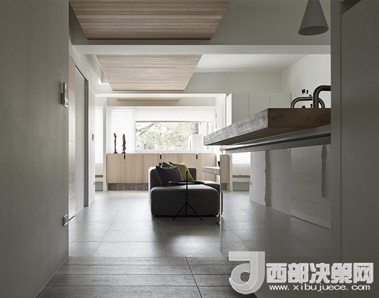 站在長(zhǎng)廊一頭視線忍不住會(huì)跟著木質(zhì)頂板向前眺望,一直延伸至窗外,室外的采光經(jīng)過漫反射幾乎可以引入整個(gè)客廳。