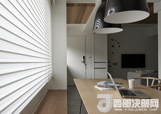為了符合簡(jiǎn)單純粹的設(shè)計(jì)理念,沒有電視柜的背景墻上放置了一個(gè)藝術(shù)時(shí)鐘,可移動(dòng)的數(shù)字設(shè)計(jì)展現(xiàn)了一種道家的精神。
