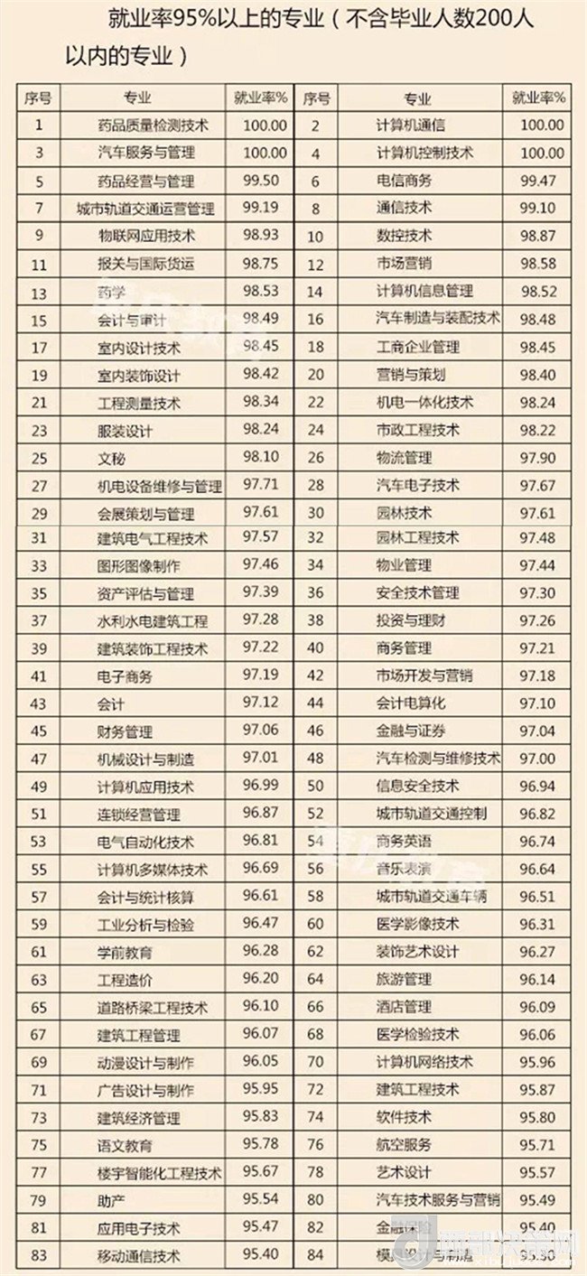 專科:各專業(yè)大類畢業(yè)生就業(yè)率均在92.00%以上 4個(gè)專業(yè)就業(yè)率達(dá)100%