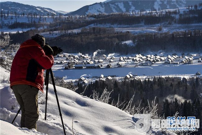 白雪潑出“熱”新年 1月2日,一名游客在拍攝晨曦中的禾木村。(記者 趙戈 攝)