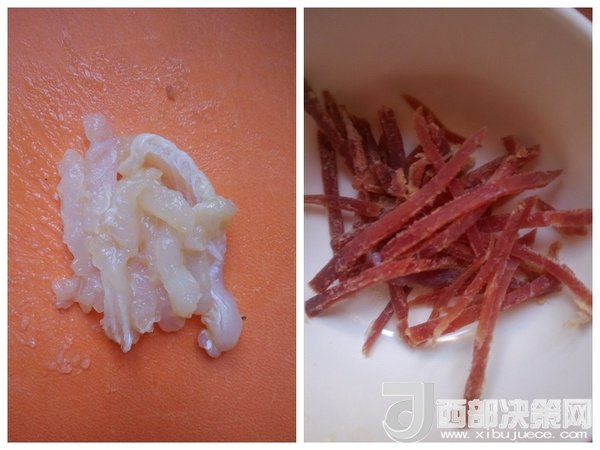 5、提前腌好的魚(yú)肉切成更短更細(xì)的小條;