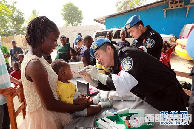 2017年12月28日,在利比里亞蒙羅維亞,中國維和警察防暴隊醫(yī)療人員為兒童做口腔檢查。當日,中國第五支駐利比里亞維和警察防暴隊派出醫(yī)護人員前往蒙羅維亞市本森威爾社區(qū)孤兒院,為兒童和員工進行義診。(趙小新攝)