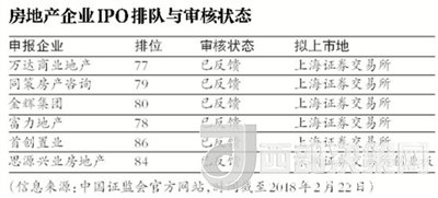 據(jù)中國證監(jiān)會最新公布的《發(fā)行監(jiān)管部首次公開發(fā)行股票審核工作流程及申請企業(yè)情況》顯示,截至2018年2月22日,證監(jiān)會受理首發(fā)企業(yè)438家,其中,已過會27家,未過會411家。未過會企業(yè)中正常待審企業(yè)404家,中止審查企業(yè)7家。其中,在“涉房”企業(yè)中萬達商業(yè)地產(chǎn)、富力地產(chǎn)、同策房產(chǎn)咨詢、金輝集團、首創(chuàng)置業(yè)等繼續(xù)保持“已反饋”狀態(tài)。按照申報企業(yè)排序,分別位列77、78、79、80、86名。