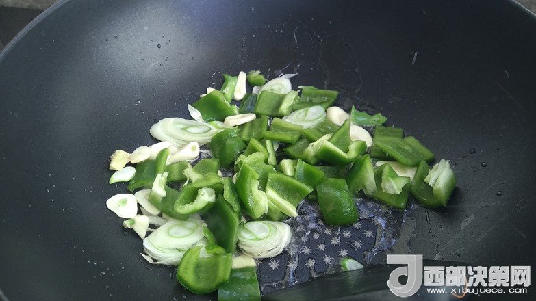 輔料料:酒5 克 胡椒粉 1克 淀粉 15克 青椒 1個 蔥白 3克 蒜片 3克 姜末 1克 生抽 2克 鹽 3克 白糖 5克
