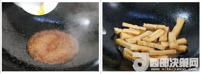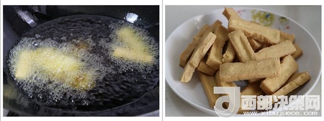 2.用油 炸豆腐,炸至金黃色撈起備用。