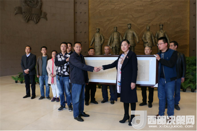 西部決策網(wǎng)——西部大開發(fā)訊(帥華鋒 通訊員 柴金霞 陳彥榮)“三月的南梁,大地處處蕩漾著春的漣漪.....”在這生機勃勃、春意盎然的美好時節(jié),中國書法家協(xié)會會員、首屆《世界華人運動大會書畫展》楷書評委、清心齋主人趙倉老師一行,帶著對革命老區(qū)的深情厚誼和對劉志丹、謝子長、習(xí)仲勛等革命先輩舍生忘死、救民出水火的崇敬之意來到革命圣地——南梁,向紀(jì)念館捐贈書法作品《長恨歌·習(xí)仲勛》。本作品系趙倉老師艱辛創(chuàng)作的佳品力作,飽含了趙倉老師豐厚的文化內(nèi)涵,真實再現(xiàn)了習(xí)仲勛老人不畏艱難、矢志堅守的人生壯麗詩篇。