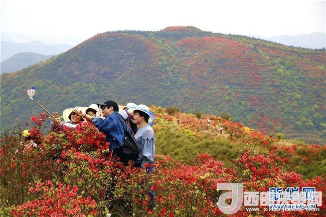 4月10日,游客在安徽銅陵鐘鳴鎮(zhèn)杜鵑山上賞花游玩。 新華社發(fā)(過(guò)仕寧 攝)