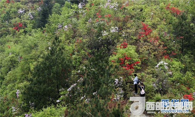 4月11日,游客在重慶市黔江國(guó)家森林公園杜鵑林里賞花游玩。 新華社發(fā)(楊敏 攝)