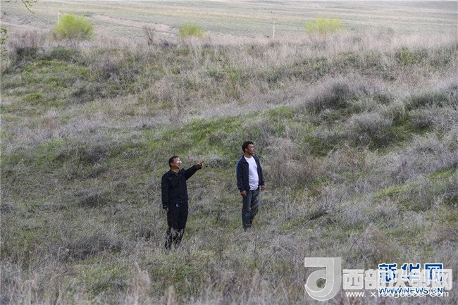 新疆霍城四爪陸龜國家級自然保護(hù)區(qū)管理局工作人員林世忠(左)和護(hù)林員伊力扎提·伊麻木在保護(hù)區(qū)內(nèi)巡查(4月15日攝)。