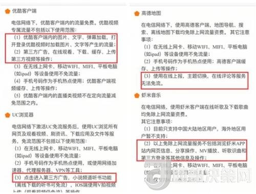 以優(yōu)酷和中國(guó)電信合作的“大小魚(yú)卡”為例,其說(shuō)明顯示,“優(yōu)酷視頻專屬流量不包括優(yōu)酷客戶端內(nèi)圖片、文字、彈幕加載、打開(kāi)優(yōu)酷視頻時(shí)加載圖片、文字等產(chǎn)生的流量。”當(dāng)然,第三方廣告也不在內(nèi)。