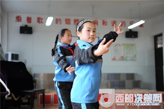 4月25日,陜西省勉縣溫泉鎮(zhèn)中心小學學生在音樂教室內進行舞蹈練習。