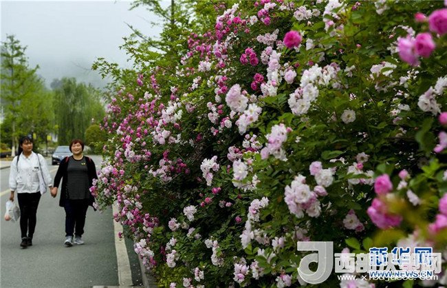 4月26日,游人走在開滿鮮花的新青川縣城街道上。新華社記者陶明攝