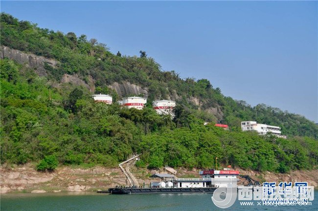 在長(zhǎng)江重慶萬(wàn)州區(qū)段,一處水上加油站掩映在綠樹(shù)之中(4月8日攝)。