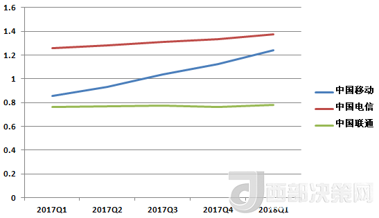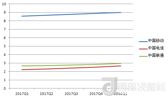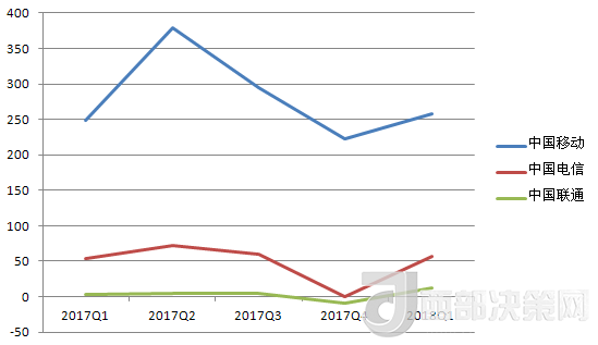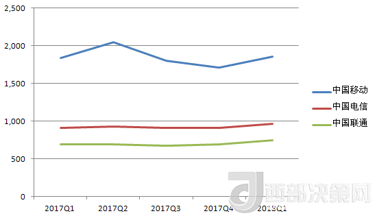 中國電信的營收除了在2017年Q3有所下降,基本處于穩(wěn)步增長趨勢。其2018年Q1的營收數(shù)據(jù)也在三大運營商中排中間。