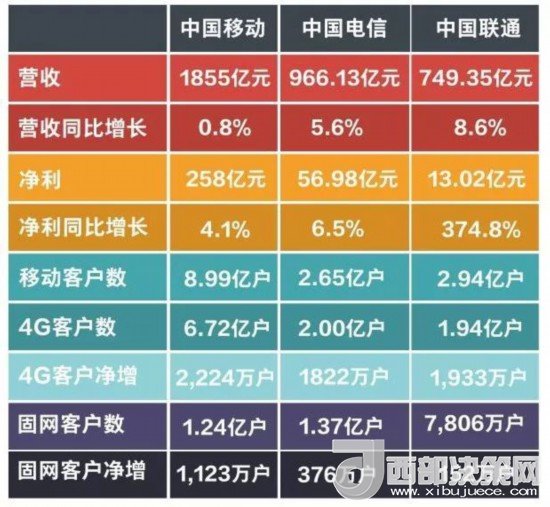 三大運營商在各方面皆呈增長態(tài)勢。移動的營收、凈利雖高,但其營收同比增長率僅為0.8%。聯(lián)通的凈利潤同比增長率高達(dá)374.8%,營收同比增幅也是最高,混改成效顯著。
