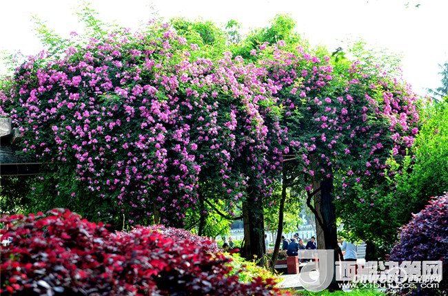5月1日,市民正在寧強縣縣城三角洲公園里的薔薇花下納涼賞花。