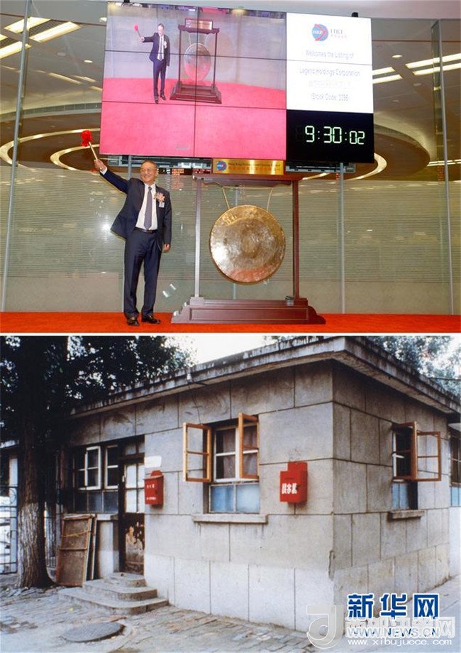 拼版照片:上圖為2015年6月29日,聯(lián)想控股在香港整體上市,聯(lián)想控股董事長、聯(lián)想集團(tuán)創(chuàng)始人柳傳志敲鐘;下圖為1984年,柳傳志等11位科研人員在一間不足20平方米的小平房(中科院計(jì)算所傳達(dá)室)中創(chuàng)辦了聯(lián)想。 新華社發(fā)