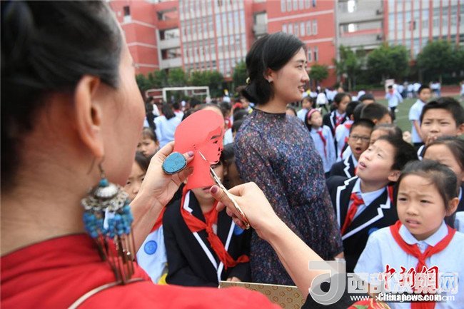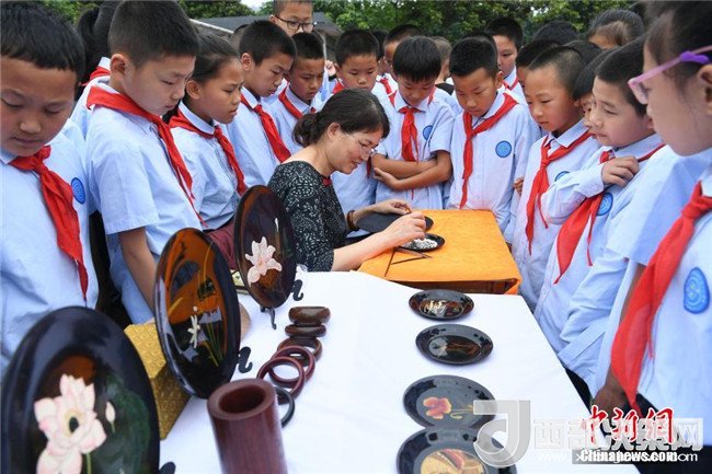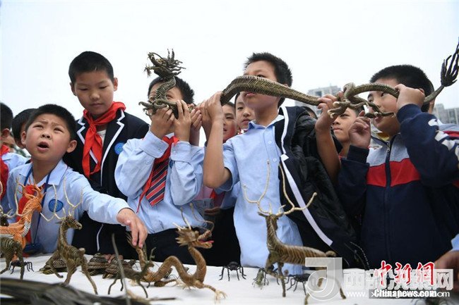 活動現(xiàn)場,15個國家級和市級非物質文化遺產項目為重慶沙坪壩西永第一小學校的師生帶來一場豐盛文化遺產大餐,讓師生們近距離感受了中華優(yōu)秀傳統(tǒng)文化的魅力。圖為活動現(xiàn)場學生們參觀非物質文化遺產項目。 陳超 攝