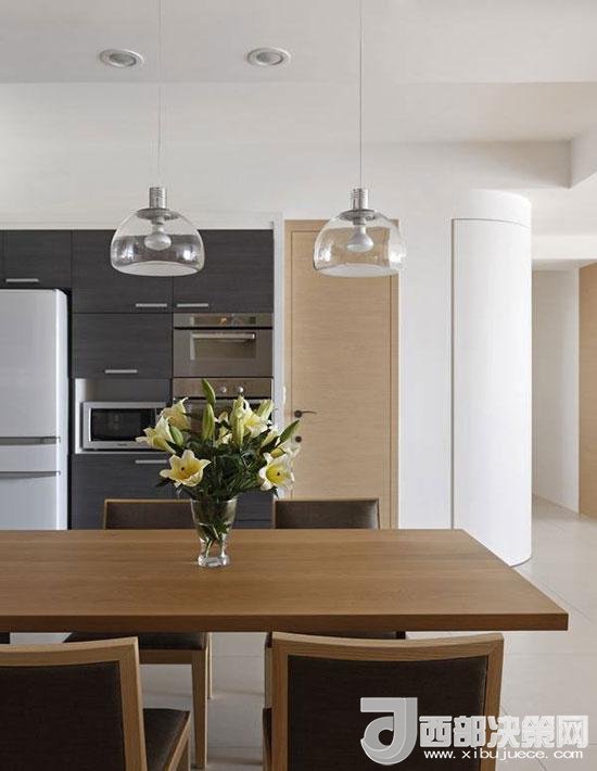 透明的圓弧形吊燈成為餐廳里的點睛之筆,輕巧又有設(shè)計感。