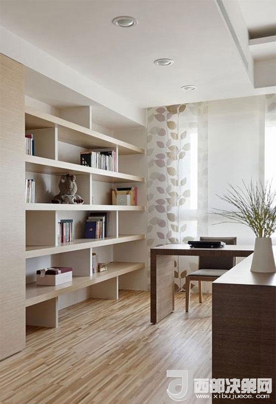 半開放式的書房空間,設(shè)計師利用梁下的空間規(guī)劃錯落線條層架,層疊中見簡約美好。