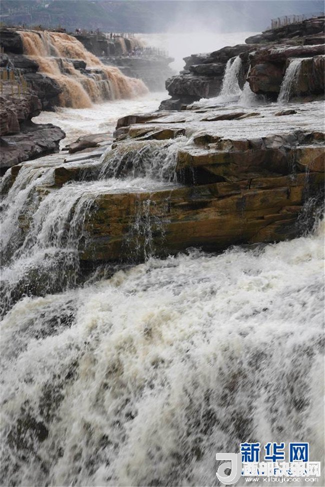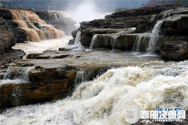 近日,受上游局部地區(qū)強降雨影響,黃河壺口瀑布出現西邊濁浪翻滾、東邊白浪滔滔的奇特景觀,吸引了眾多游客前來觀看。 新華社發(fā)(呂桂明 攝)
