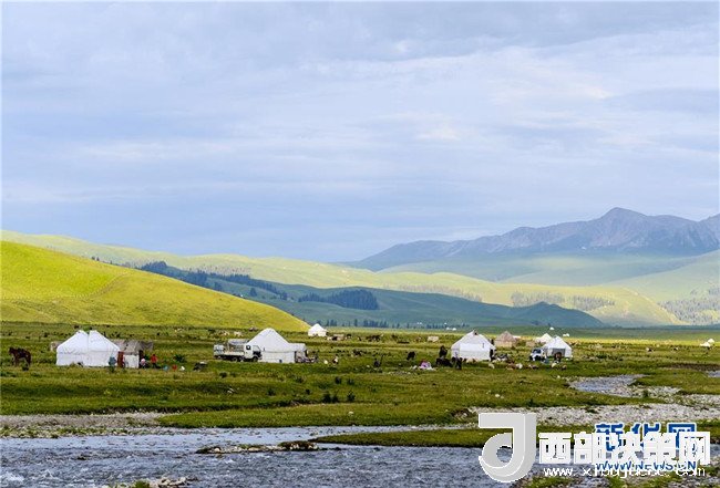在那拉提景區(qū)里,鞏乃斯河旁的牧民正在準(zhǔn)備晚餐(7月8日攝)。