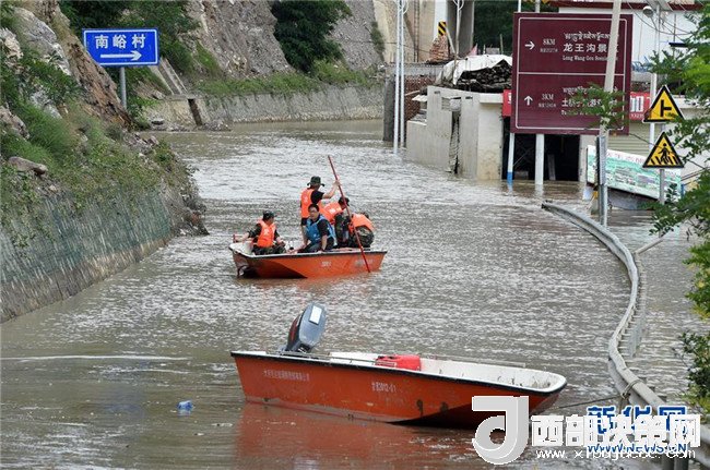 7月15日,在舟曲縣南峪鄉(xiāng),工作人員乘坐沖鋒舟開展險情處置。