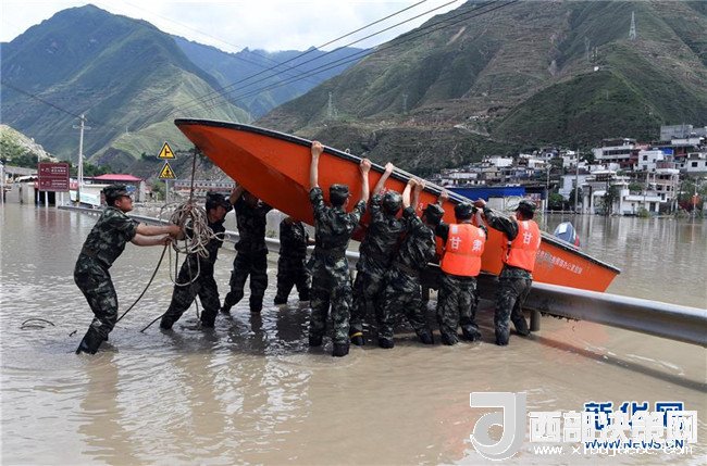 7月15日,在舟曲縣南峪鄉(xiāng),武警甘南支隊?wèi)?zhàn)士在搬運沖鋒舟。