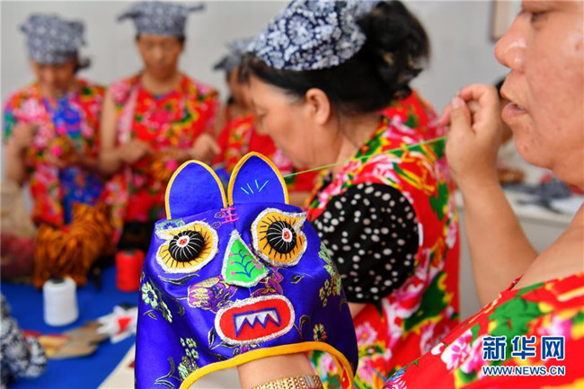 山西省臨縣寨則坪村是呂梁山上典型的貧困村。2017年5月,該村邀請縣里的老手藝人對10余位婦女進(jìn)行布藝加工的集中培訓(xùn),并在村委院子里建起了布藝加工廠。靠著加工富有當(dāng)?shù)靥厣男瑝|、肚兜、布老虎等工藝品,這些婦女每月能拿到1500元的工資,這幫助她們順利摘下了“窮帽子”。新華社記者 曹陽 攝
