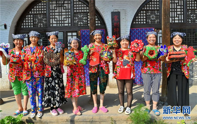 7月18日,臨縣寨則坪村的村民們在展示新生產(chǎn)的工藝品。