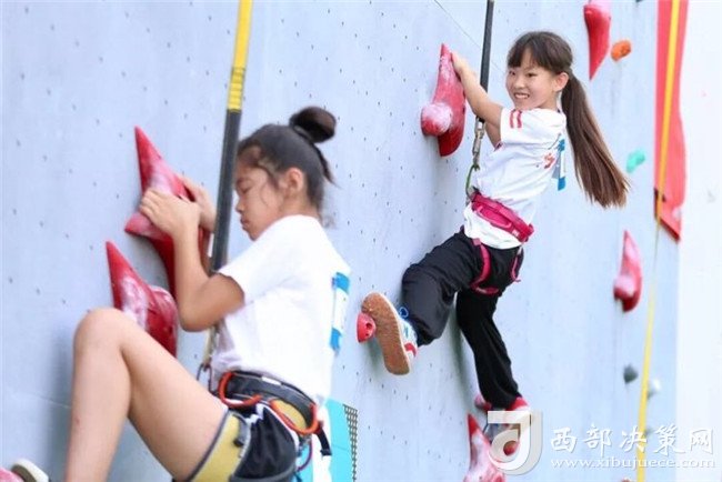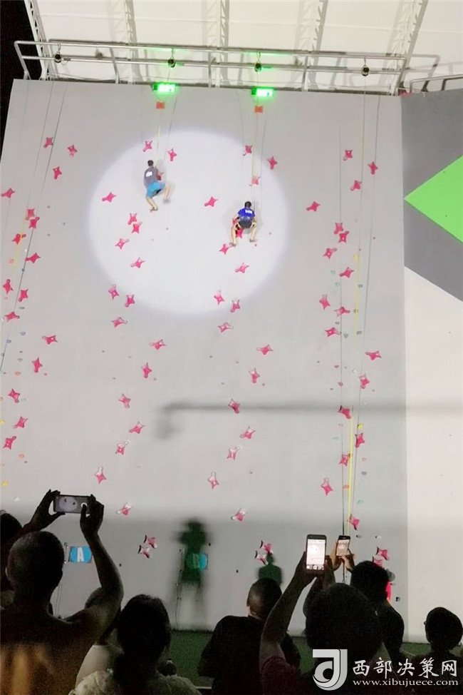 專業(yè)攀巖選手與資深攀巖愛好者在難度賽道進(jìn)行表演賽
