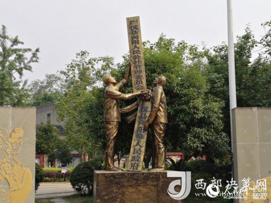 向陽鎮(zhèn)幸福廣場上“人民公社摘牌”雕塑。(記者陳曦 攝)