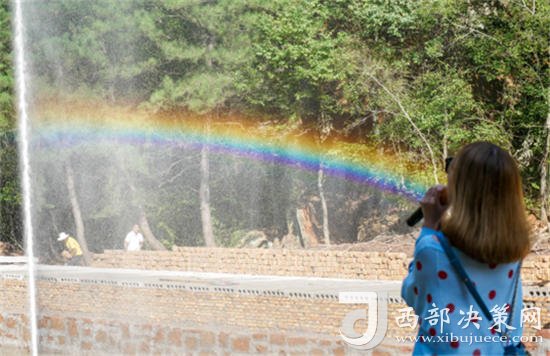 在搖擺橋的旁邊,就是引來眾多體驗者的“彩虹喊泉”游玩項目。游客使用話筒大聲呼喊,噴泉會根據(jù)音量的大小“舞蹈”,此時天空中像下起雨一般,雨過天晴,彩虹映入眼簾,浪漫的氛圍便由此營造而來。