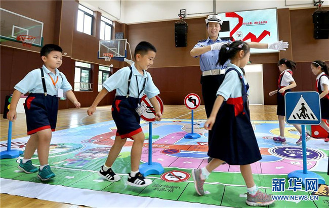 9月3日,小學生在民警指揮下模擬通過人行橫道。