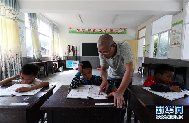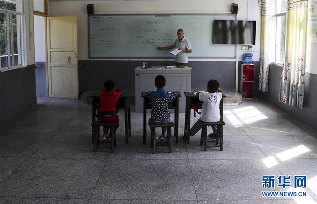 9月3日,重慶市黔江區(qū)石家鎮(zhèn)滲壩小學(xué)老師冉景旭給3名學(xué)生上課。