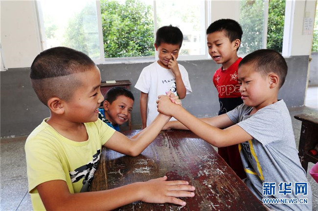 9月3日,重慶市黔江區(qū)石家鎮(zhèn)滲壩小學(xué)的學(xué)生在課間做游戲。