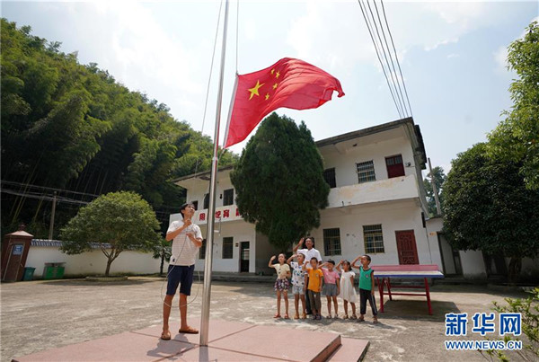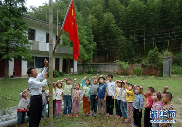 9月4日,在蘆嶺教學(xué)點(diǎn),陳云根(后)和黃文春(前)帶著全校6名學(xué)生升國(guó)旗。現(xiàn)在學(xué)校操場(chǎng)已經(jīng)鋪上了水泥。新華社記者 宋振平 攝