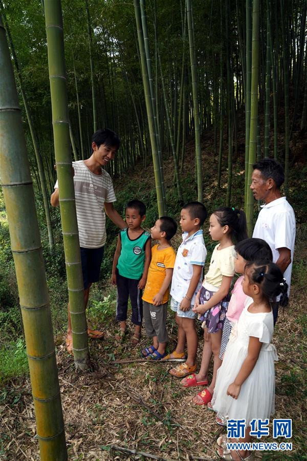 9月4日,黃文春(左一)和陳云根帶著學(xué)生們來(lái)到學(xué)校附近的山林,為孩子們講解竹子的生長(zhǎng)過(guò)程。 新華社記者 汪明麗 攝