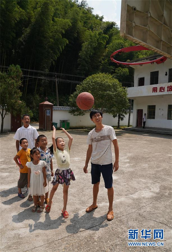 9月4日,在蘆嶺教學(xué)點(diǎn),陳云根(左一)和黃文春(右一)帶著孩子們上體育課。 新華社記者 宋振平 攝