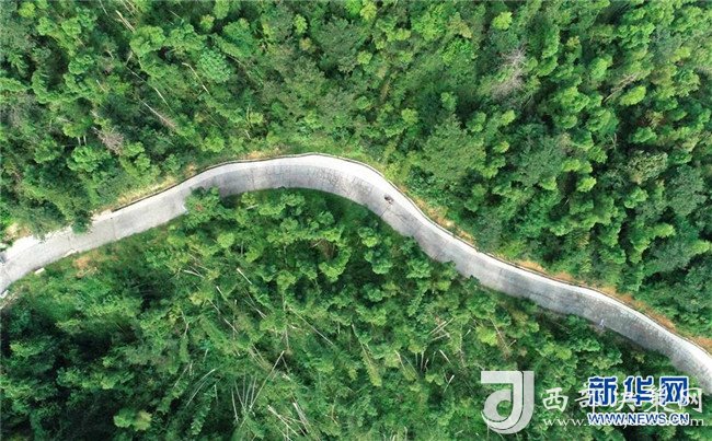 高自仁駕駛助力車(chē)行駛在前往梅嶺鎮(zhèn)立新村立新學(xué)校的山路上(9月4日無(wú)人機(jī)拍攝)。新華社記者 彭昭之?dāng)z