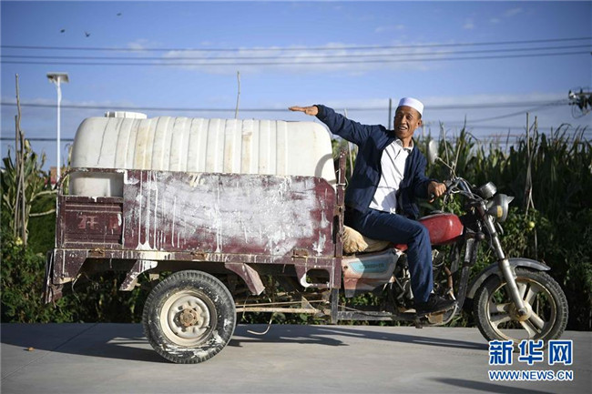 在中寧縣喊叫水鄉(xiāng)賀家口子村,村民賀金文在介紹他曾經(jīng)到外地拉水時(shí)用的水桶(9月6日攝)。新華社記者 王鵬 攝