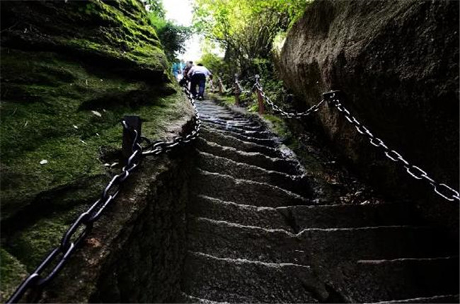 云梯高十余米,與地面垂直呈90度角,中上部外突,呈倒坎崖之勢(shì)。梯上置懸索三條,游人挽索而攀,身體無法貼近崖壁,因而隨索擺動(dòng),心旌神搖,如同云駕霧,故名云梯。云梯的開辟,既縮短了自中峰登東峰的時(shí)間,又增加了游人履險(xiǎn)的興趣,開通以來,許多游客都愿在此攀登,一試身手。