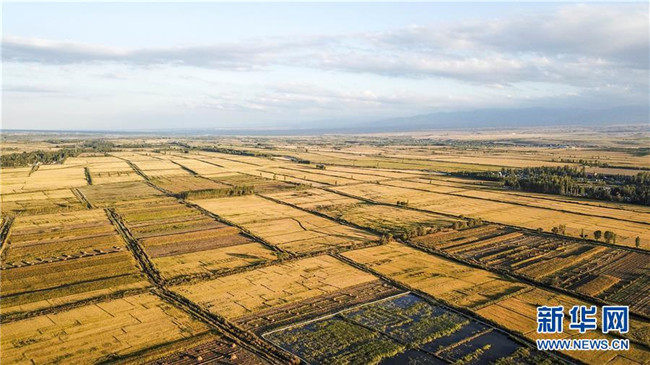 新疆察布查爾錫伯自治縣坎鄉(xiāng)待收割的水稻(9月25日無人機拍攝)。眼下,地處新疆伊犁河谷的察布查爾錫伯自治縣約20萬畝水稻迎來收割季。當(dāng)?shù)剞r(nóng)民搶抓農(nóng)時,忙碌在金色田園中。記者 胡虎虎 攝