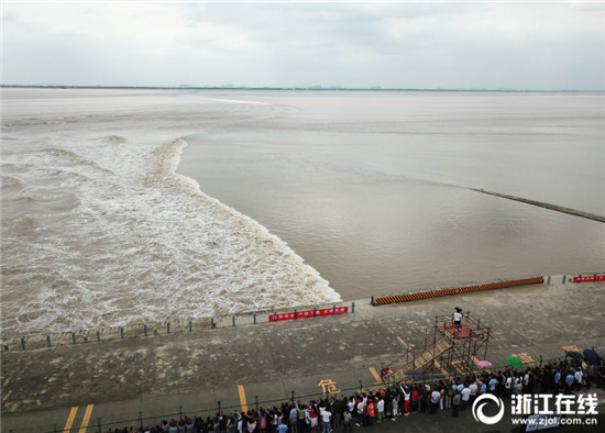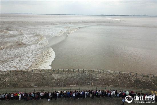 9月26日,農(nóng)歷八月十七,海寧大缺口觀潮點,千名游客在江堤上安全觀潮。(浙江在線記者 董旭明 攝)