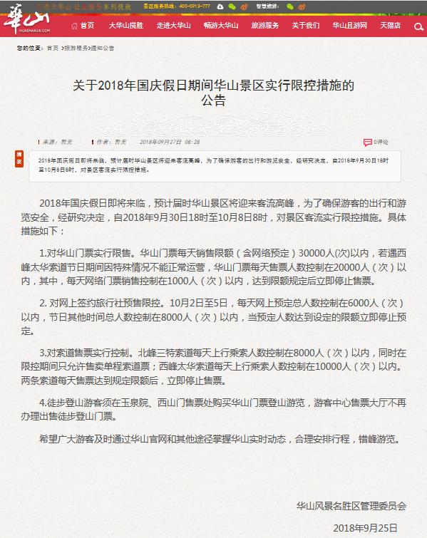 2018年國慶假日即將來臨,預(yù)計屆時華山景區(qū)將迎來客流高峰,為了確保游客的出行和游覽安全,經(jīng)研究決定,自2018年9月30日18時至10月8日8時,對景區(qū)客流實(shí)行限控措施。具體措施如下:
