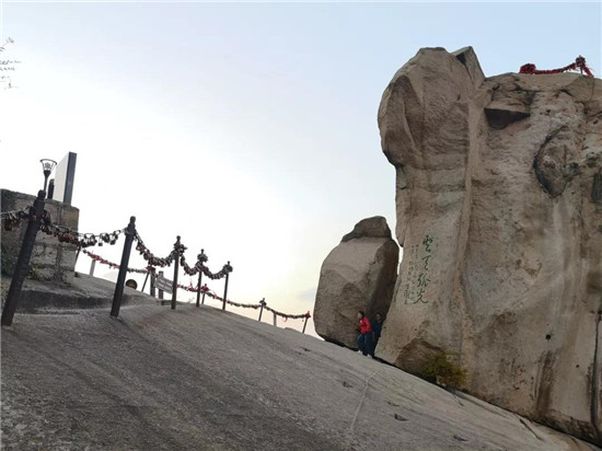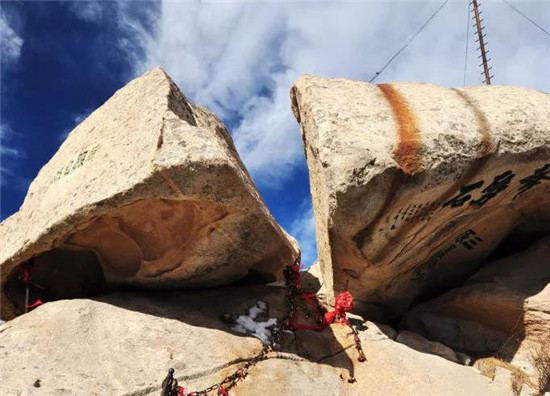 華山以石著名,每一處奇石都有一個美麗而動人的傳說。過了擦耳崖,看到的這兩塊石頭叫“日月巖”,左邊的代表“日”,右邊的代表“月”,上面這四個字是“云天弧光”,有時在夜晚,這里會出現(xiàn)一道非常耀眼的光。相傳武則天當(dāng)年上華山走這里,看到這兩塊形似日月的石頭,就別出心栽地給自個兒的字號創(chuàng)造了一個“瞾”字,因?yàn)檫@兩塊奇石上頂青天,下臨空谷,唯我獨(dú)尊,是光明與權(quán)威的象征。