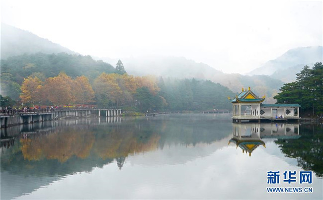當(dāng)日,位于江西省九江市廬山風(fēng)景區(qū)內(nèi)的如琴湖云霧繚繞,層林盡染,吸引眾多游客前來(lái)觀賞游玩。