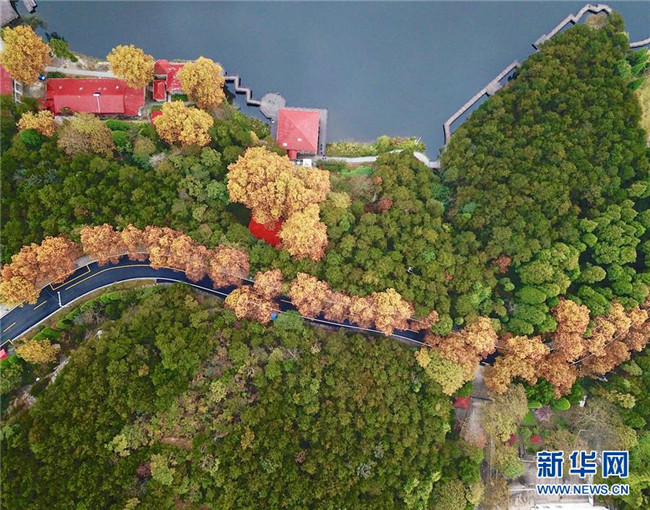 這是如琴湖旁公路的秋色風(fēng)光(10月20日無(wú)人機(jī)拍攝)?! ⌒氯A社記者 胡晨歡 攝