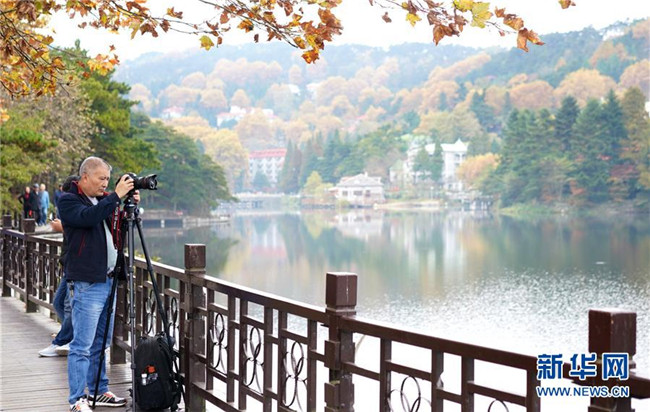 游客在九江市廬山風(fēng)景區(qū)內(nèi)的如琴湖旁攝影(10月20日攝)。 新華社記者 胡晨歡 攝
