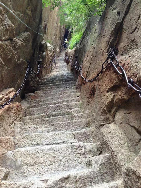 一是直上云頭。如千尺幢、上天梯、否梯、百尺峽等,開鑿于石隙崖壁,直上直下,有聳入云天之勢;二是凌空載道。一邊臨壁,一邊凌空,奇絕險(xiǎn)要。如南峰長空棧道、北峰至蒼龍嶺棧道;